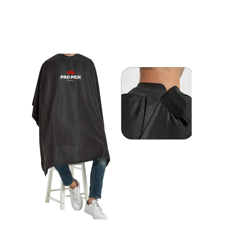 Professional-grade, water-resistant salon cape in sleek jet black—choose the iconic Pro Pick logo or personalize it with your own custom branding.