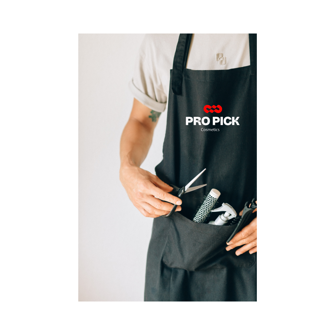 Durable, water-resistant salon apron with adjustable neck strap and roomy pockets—customize with the Pro Pick logo or your own salon branding.